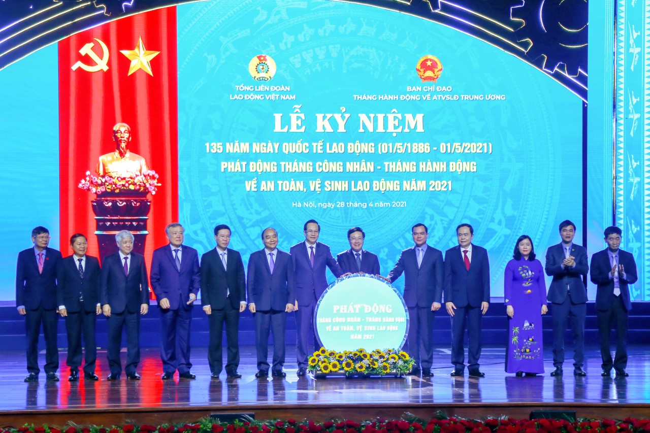 Tại buổi Lễ, Lãnh đạo Chính phủ, Bộ LĐ-TBXH và Tổng Liên đoàn Lao động Việt Nam thực hiện nghi thức phát động Tháng công nhân và Tháng hành động về an toàn, vệ sinh lao động năm 2021.